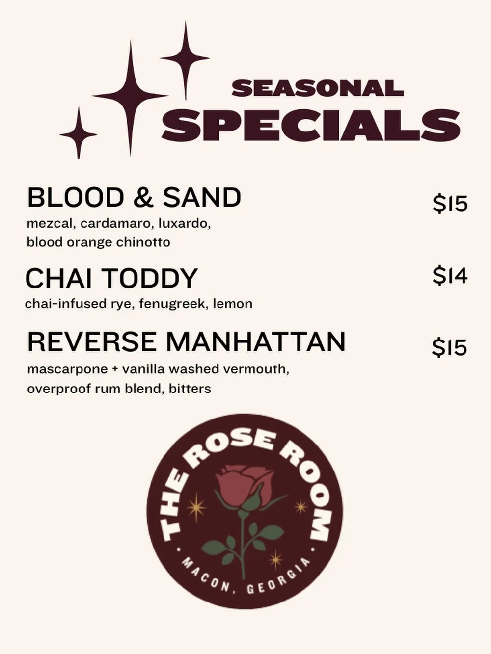 Located in historic downtown Macon, Georgia, The Rose Room is a cocktail bar open 5pm until midnight Wednesday through Sunday. Checkout our menu below and our social media for more specials. Our full spirit list is also available for you to sample.